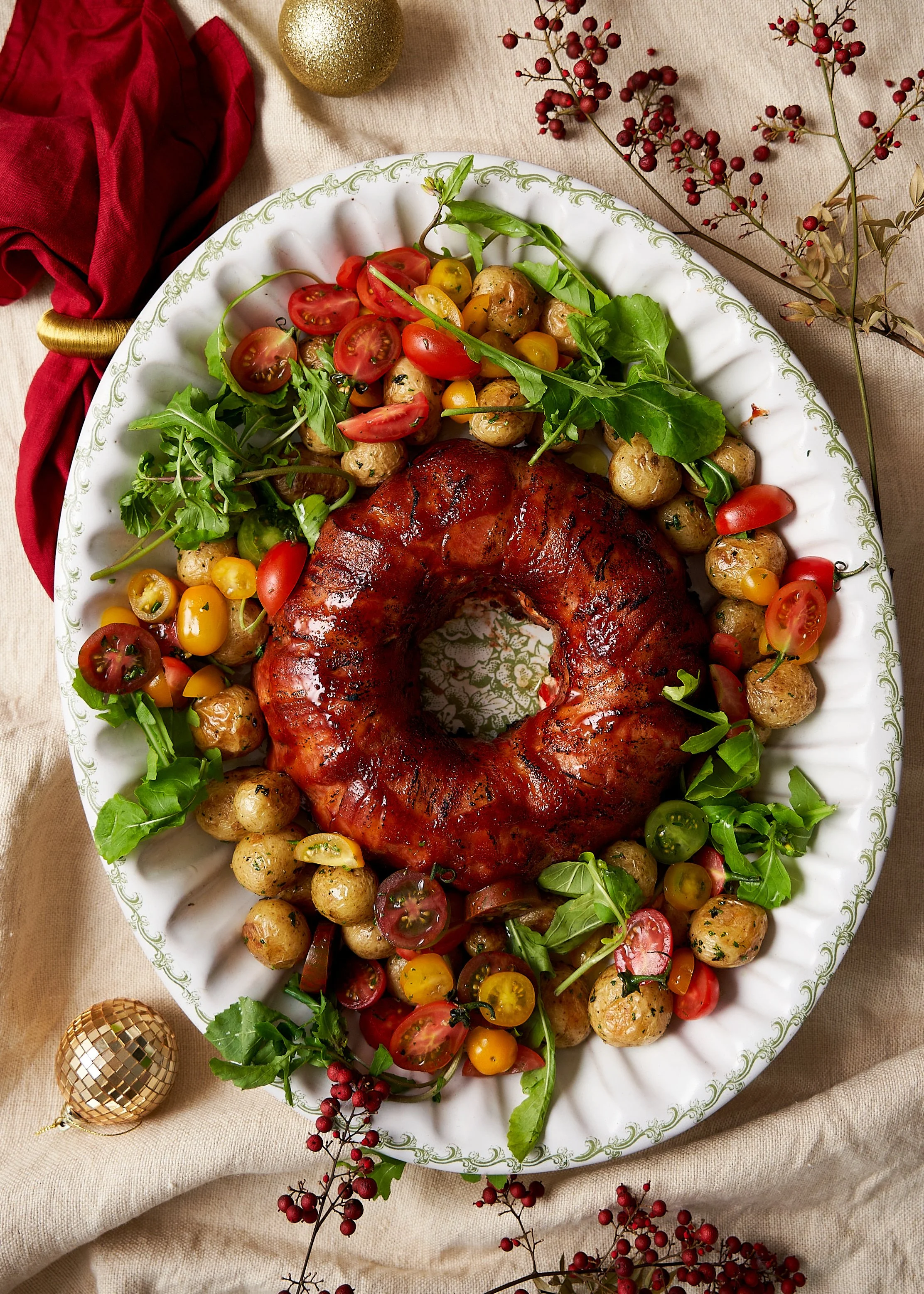 A meatloaf baked in a Bundt pan, made with beef mince, a feta cheese, Peppadew® and onion marmalade stuffing, barded with overlapping bacon strips and basted with a tangy sauce. Served with baby potatoes and a fresh tomato and herb salad.