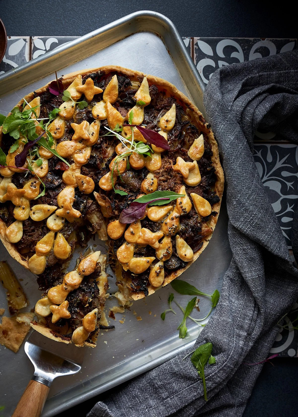A baked pastry case filled with a rich leftover lamb and mushroom sauce, pasta and bechamel cooked and served in one pot, the ideal dish for a loadshedding meal.