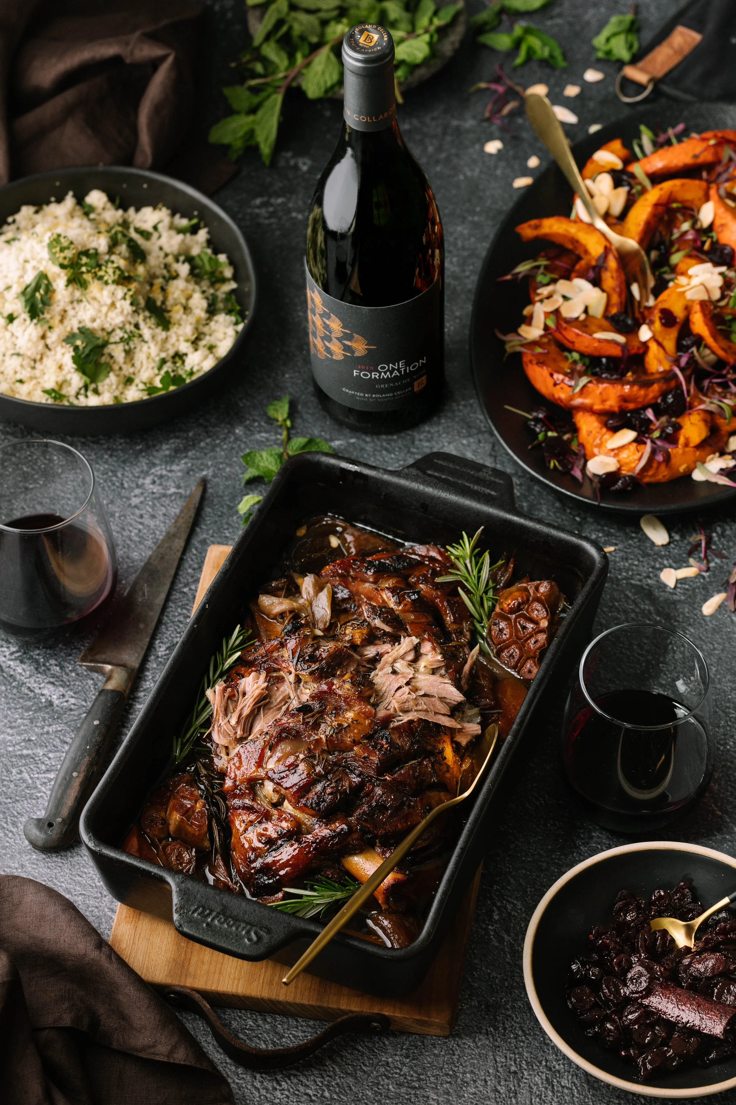 Slow roasted lamb shoulder with spiced pumpkin, wine soaked cranberries & herbed couscous